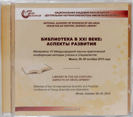 Библиотека в XXI веке: аспекты развития = Library in the XXI century: aspects of development : материалы VII Междунар. науч.-практ. конф. молодых ученых и специалистов, Минск, 29–30 окт. 2015 г. / НАН Беларуси, Центр. науч. б-ка им. Якуба Коласа ; редкол.: Л. А. Авгуль, А. И. Груша (отв. ред.), Е. Е. Долгополова, О. М. Дрозд, Н. А. Яцевич, М. П. Ахремчик ; ред.: М. М. Лис ; библиогр. ред.: О. С. Платковская ; пер. на англ. яз.: О. Н. Чикун ; рец.: Ю. А. Переверзева, В. Н. Венгеров. – Мн. : Ковчег, 2016. – 1 CD-ROM.