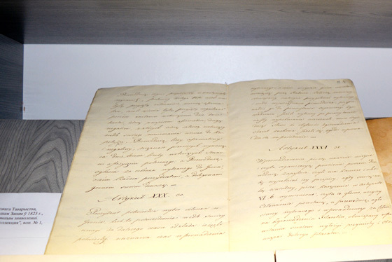 Пачыналася экспазіцыя з рукапіснага дакумента аднаго з заснавальнікаў тайнага студэнцкага таварыства Тамаша Зана. Гэта перапісаны ім ад рукі Статут Таварыства. Запіс быў зроблены ў 1823 г., калі Тамаш Зан знаходзіўся ў турэмным зняволенні. Дакумент захоўваецца ў рукапісным фондзе «Калекцыя» аддзела рэдкіх кніг і рукапісаў.