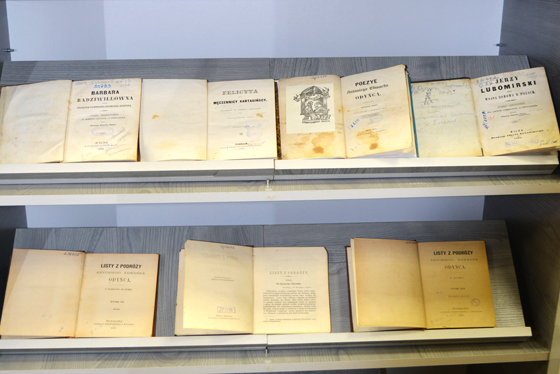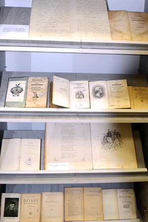 Таксама прадстаўлены варшаўскія, львоўскія і парыжскія прыжыццёвыя выданні Адама Міцкевіча, сярод якіх зборнік паэзіі А. Міцкевіча (Парыж, 1829), які калісьці належаў бібліятэцы Радзівілаў Несвіжскай ардынацыі. Трэба адзначыць асобнік прыжыццёвага выдання Адама Міцкевіча — эпічную паэму «Гражына». Кніга вялікага фармату выйшла ў Познані ў 1864 годзе. У кнізе гравюры мастака Антонія Залескага, сам тэкст размешчаны у арнаментальнай рамцы. Дадатковую раскошу выданню дадаюць муаравыя форзацы.
