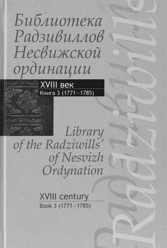 Библиотека Радзивиллов Несвижской ординации = Library of the Radziwills’ of Nesvizh Ordynation : каталог изданий из фондов Центр. науч. б‑ки им. Якуба Коласа Нац. акад. наук Беларуси: XVIII век. В 4 кн. – Кн. 3 (1771–1785) / Нац. акад. наук Беларуси, Центр. науч. б‑ка им. Якуба Коласа ; сост.: А. В. Стефанович, М. М. Лис ; ред. библиогр. записей О. М. Дрозд, . И. Л. Мурашова ; редкол.: А. И. Груша (гл. ред.) [и др.]. – Минск : Беларус. навука, 2014. – 847 с. : ил.