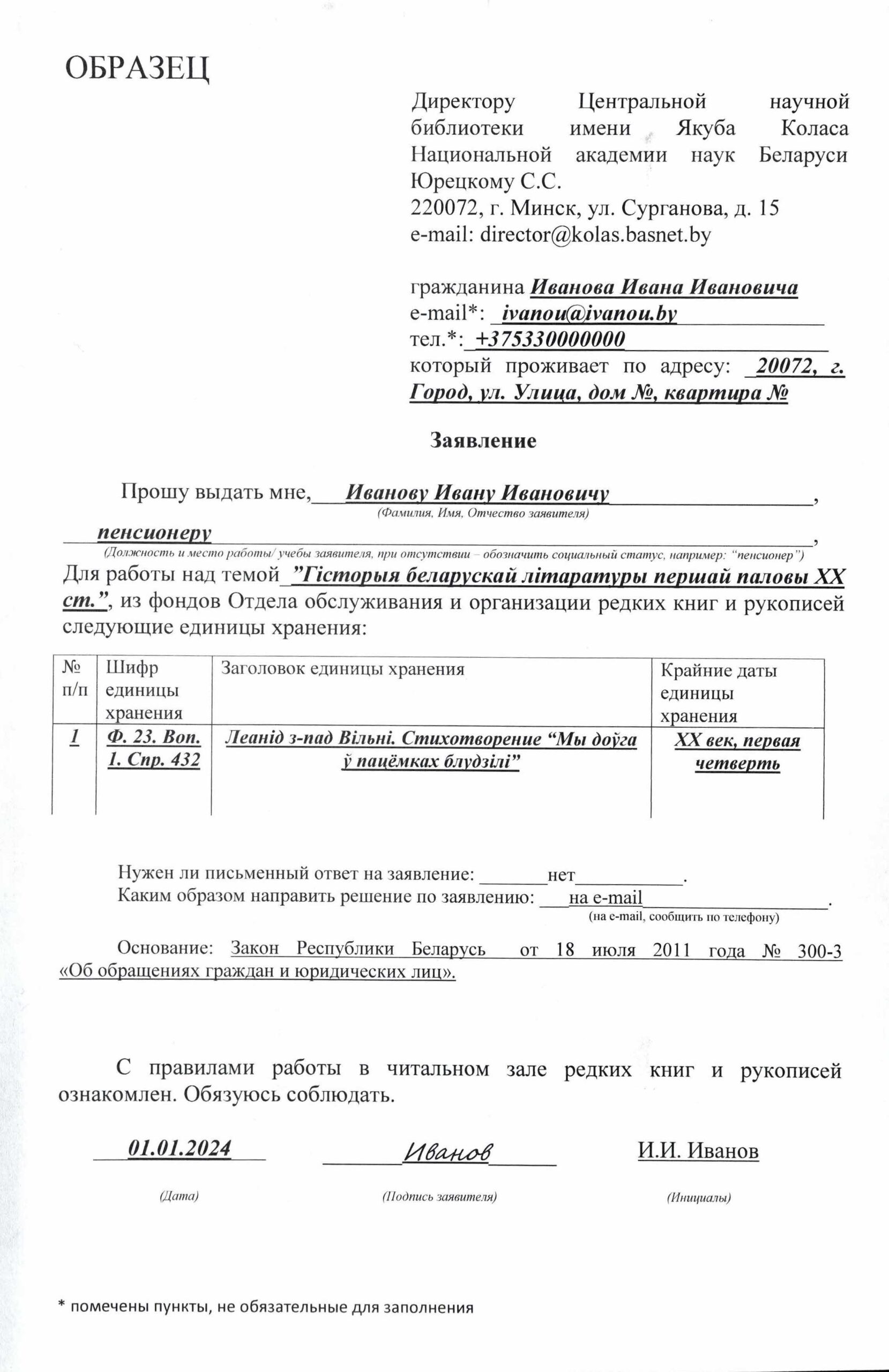 Образец ходатайства для работы с фондом в читальном зале редких книг и рукописей