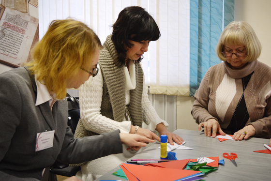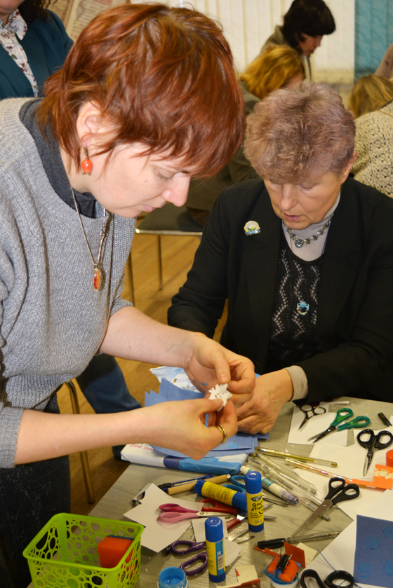 Ольга Ивановна Новицкая, педагог объединения по интересам «Первоцвет» образцовой студии декоративно-прикладного творчества «Крынічка», показала, как создатьинтерьерные композиции из бумаги «Калядныя зорачкі».