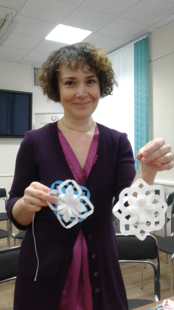 Вместе с Инной Ремуальдовной Шейх, руководителем народной студии фитодизайна «Славянский венок», участники изготовили елочные игрушки в технике оригами «Елочка и Дед Мороз».