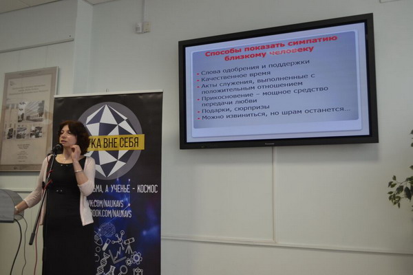 Она коснулась вопросов о том, как любовь, влюблённость и привязанность людей влияют на их гормональный фон, рассказала об основных гормонах – тружениках этого «невидимого фронта». Эксперт объяснила реакцию организма на психологические факторы, факторы питания и образа жизни человека, привела примеры исследований, проведённых в этой области. Кроме того, все присутствующие получили ценные рекомендации специалиста, касающиеся этики взаимоотношений и развития эмоционального интеллекта.