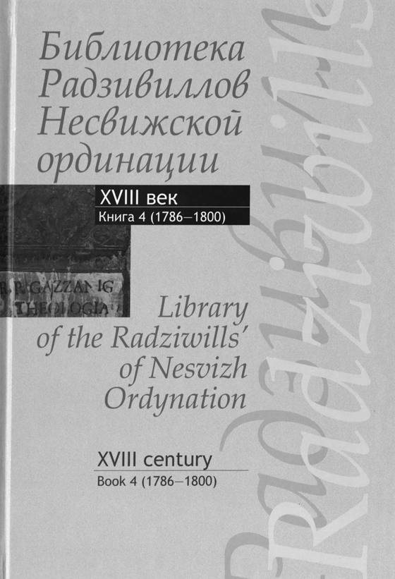 Библиотека Радзивиллов Несвижской ординации = Library of the Radziwills of Nesvizh Ordynation : каталог изданий из фондов Центр. науч. б‑ки им. Якуба Коласа Нац. акад. наук Беларуси: XVIII век. В 4 кн. – Кн. 4 (1786–1800) / Нац. акад. наук Беларуси, Центр. науч. б‑ка им. Якуба Коласа ; сост.: А. В. Стефанович, М. М. Лис ; ред. библиогр. записей О. М. Дрозд, . И. Л. Мурашова ; редкол.: А. И. Груша (гл. ред.) [и др.]. – Минск : Беларус. навука, 2015. – 583 с. : ил.