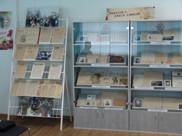 На стеллажах партизанские настенные газеты – «Молодежь Белоруссии в борьбе за Родину. Комсомольский бюллетень.»(№ 1, 1944 г.); «Сталинское племя. Ежедекадная газета межрайонного комсомольского комитета». (№ 3, 1943 г.); «Мы отомстим. Газета Н‑ской партизанской бригады». (№ 10, 1943 г.); «Народный мститель. Орган партийной организации Н‑ского партизанского полка». (№ 4, 1943 г.) и др.