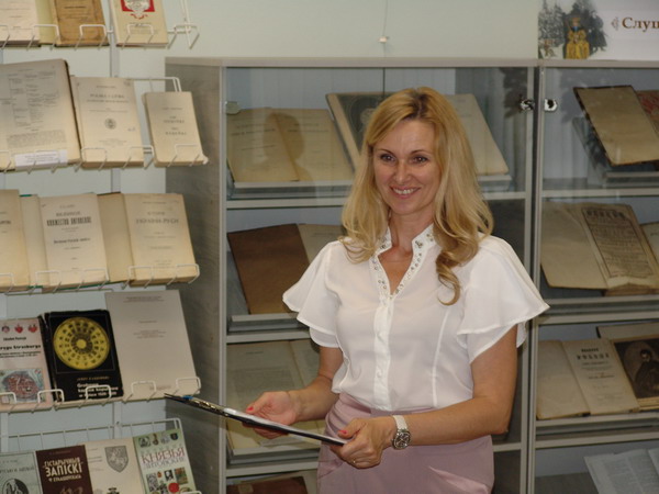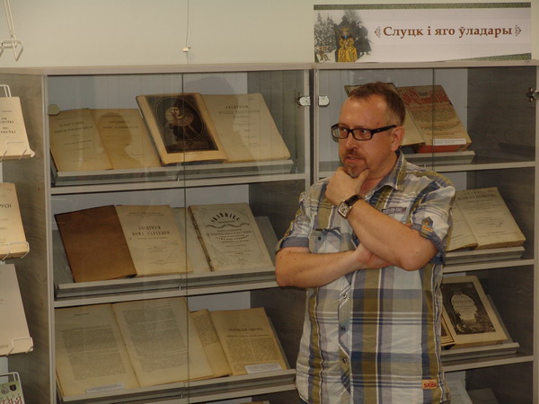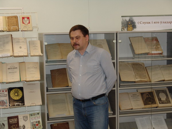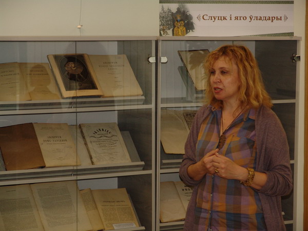 Научный сотрудник отдела редких книг и рукописей ЦНБ НАН Беларуси Инна Мурашова ознакомила присутствующих с выставкой “Слуцк і яго ўладары”, остановившись на наиболее интересных изданиях XVI–XXI вв., представленных в экспозиции.
