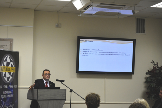 С завершающей лекцией об особенностях развития верховых болот, распространении их на территории Беларуси, характерных чертах торфяной залежи и растительного покрова выступил заместитель директора по научной и инновационной работе Института экспериментальной ботаники им. В. Ф. Купревича НАН Беларуси кандидат биологических наук Дмитрий Геннадьевич Груммо (презентация).