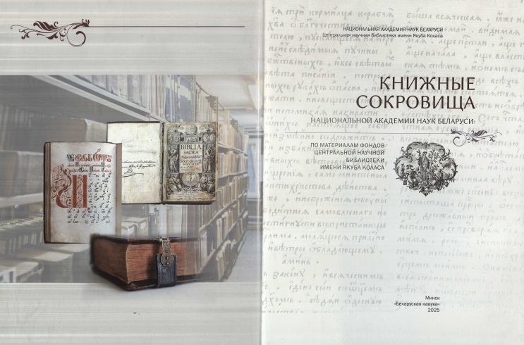 12 декабря 2025 г. в 14.00 в Центральной научной библиотеке имени Якуба Коласа НАН Беларуси (ул. Сурганова 15, информационно-выставочный центр, ком. 110) состоится презентация книги «Книжные сокровища Национальной академии наук Беларуси: по материалам фондов Центральной научной библиотеки имени Якуба Коласа; сост.: О. А. Губанова [и др.] ; редкол.: С. С. Юрецкий (гл. ред.) [и др.]. – Минск : Беларуская навука, 2025. – 383 с.».