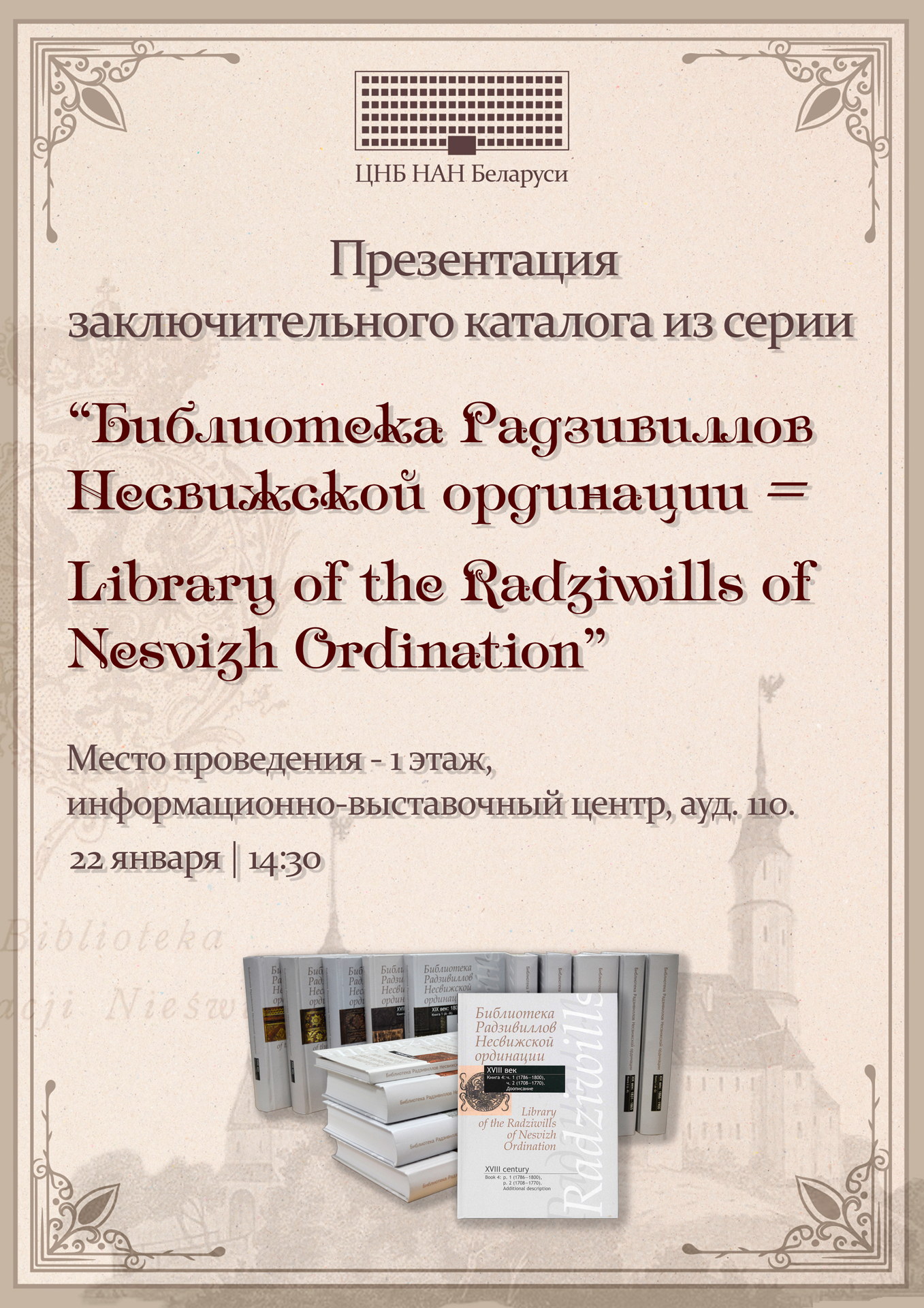 22 января 2026 г. в 14.30 в Центральной научной библиотеке имени Якуба Коласа НАН Беларуси (ул. Сурганова 15, информационно-выставочный центр, пом. 110) состоится презентация «Книги, пережившие века: книжная коллекция Радзивиллов в фонде ЦНБ НАН Беларуси», приуроченная к выходу в свет 20 тома серийного издания: «Библиотека Радзивиллов Несвижской ординации = Library of the Radziwills of Nesvizh Ordination : каталог изданий из фонда Центр. науч. б‑ки им. Якуба Коласа Нац. акад. наук Беларуси. : XVIII век. В 4 кн. Кн. 4 Ч.1. (1786–1800), ч. 2 (1708–1770). Доописание / Нац. акад. наук Беларуси, Центр. науч. б‑ка им. Якуба Коласа ; сост.: А. В. Стефанович, М. М. Лис ; ред. библиогр. записей О. В. Пирогова ; редкол.: С. С. Юрецкий (гл. ред.) [и др.]. – Минск : Беларуская навука, 2025. – 575 с. : ил.».