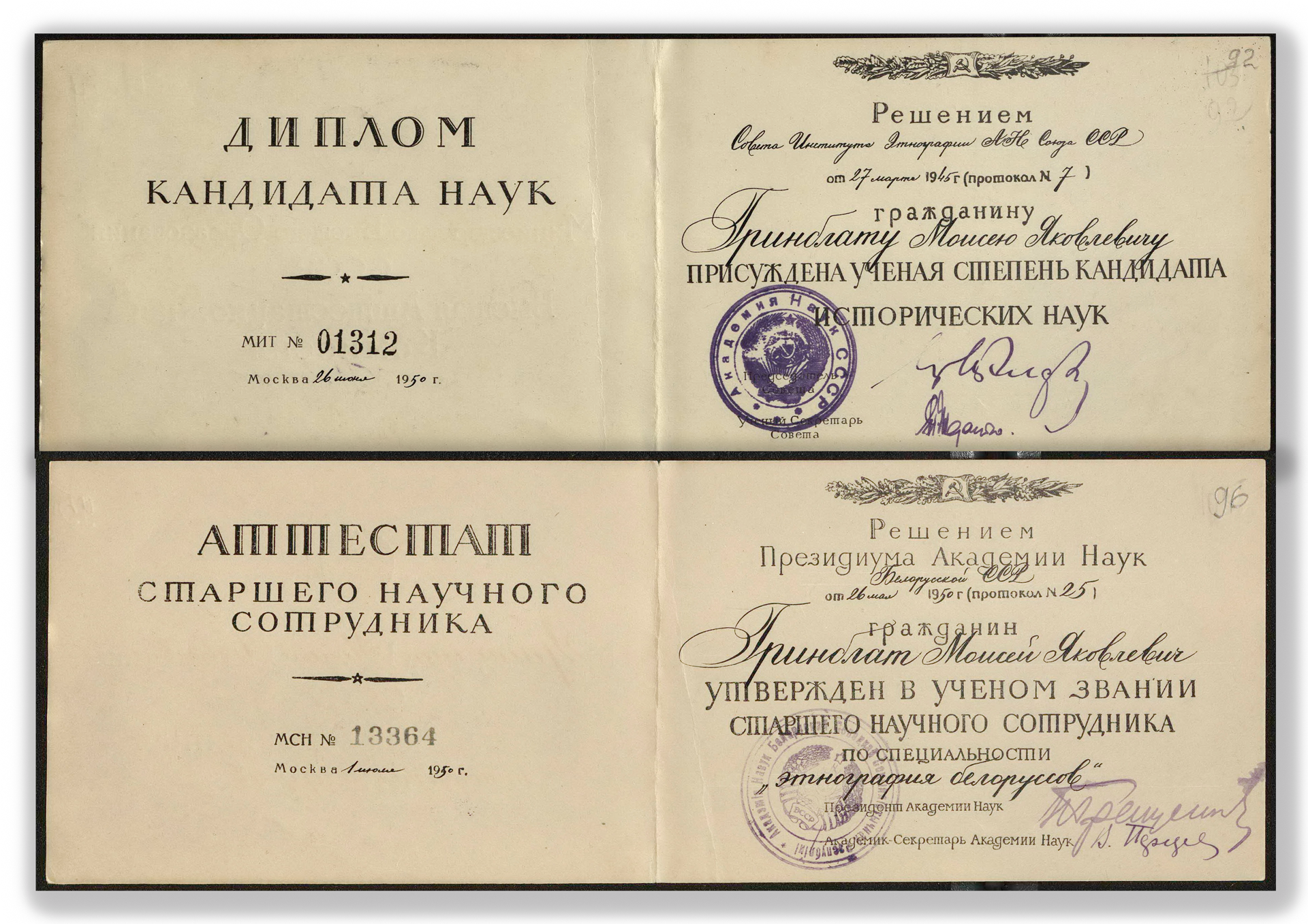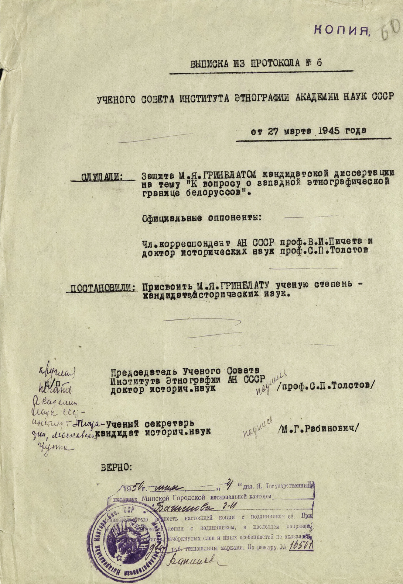 В 1945 г. защитил кандидатскую диссертацию на тему «Западная этнографическая граница белорусов».