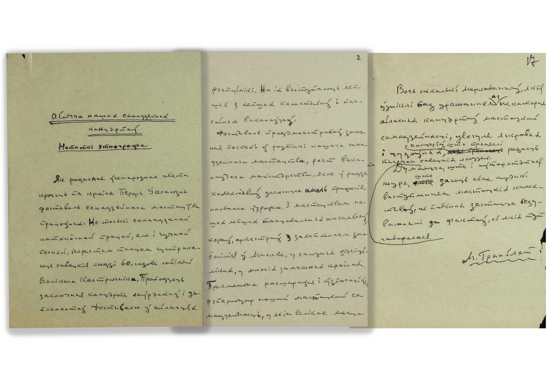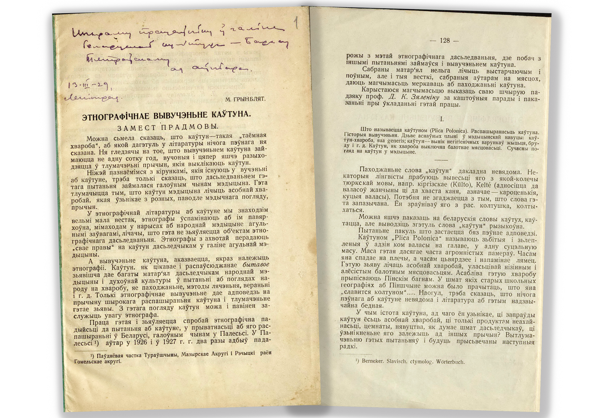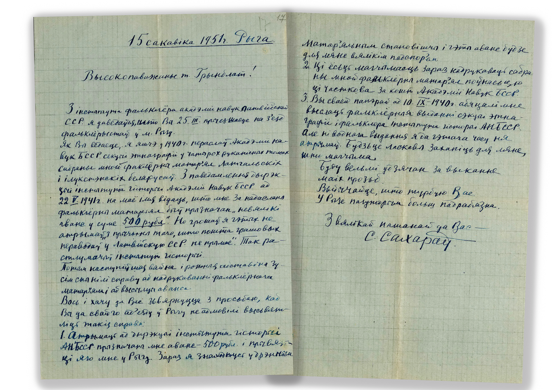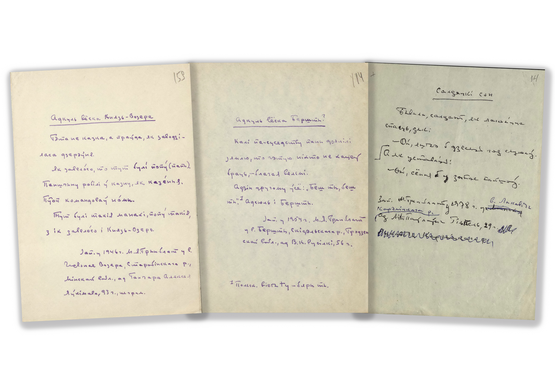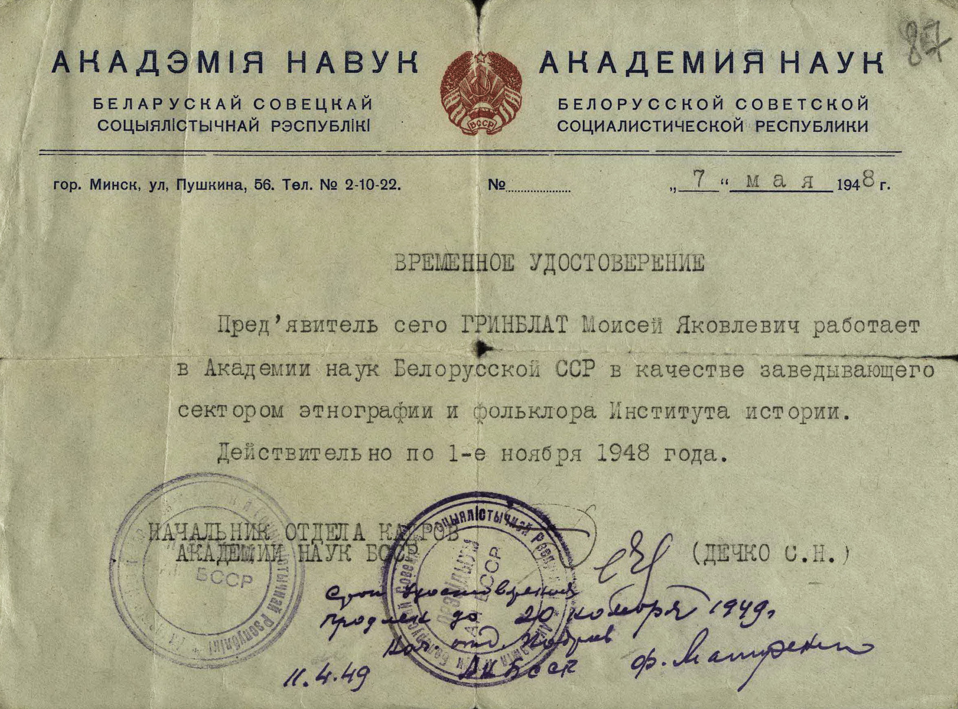 Здесь же хранятся материалы фольклорно-этнографических экспедиций Академии наук БССР (фольклорные записи, записные книжки с записями дневникового характера, прочие записи, сделанные М. Я. Гринблатом во время экспедиций, планы, отчеты и др.).