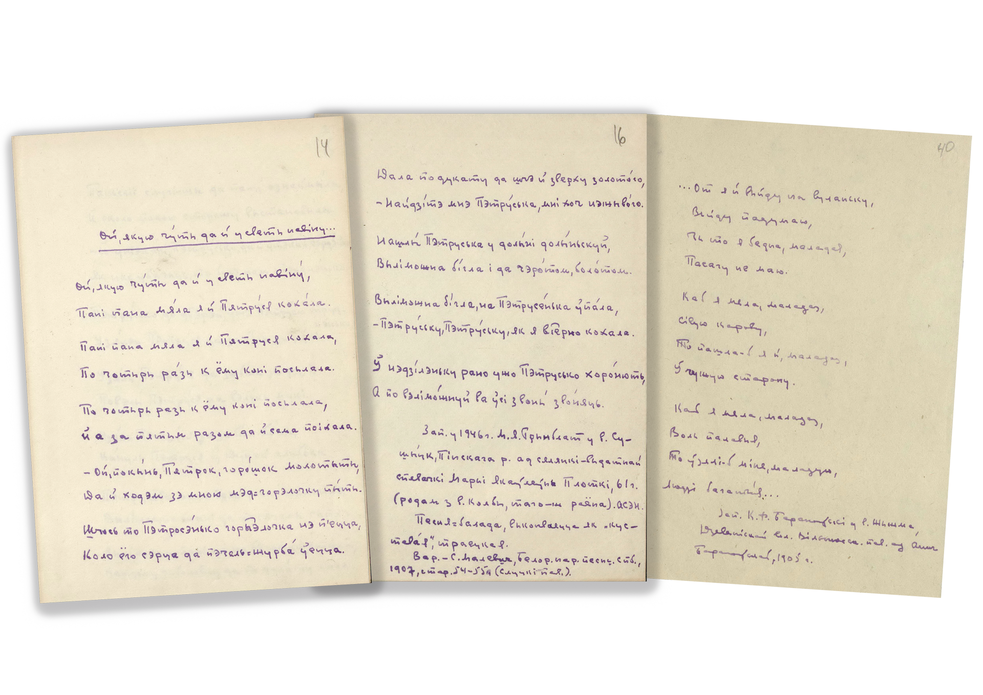 Материалы, собранные ученым в процессе его научной и творческой деятельности, включают в себя записи фольклорного материала, библиографические и тематические рабочие картотеки, многочисленные записи и выписки из разных источников по этнографии, фольклористике, топонимике.