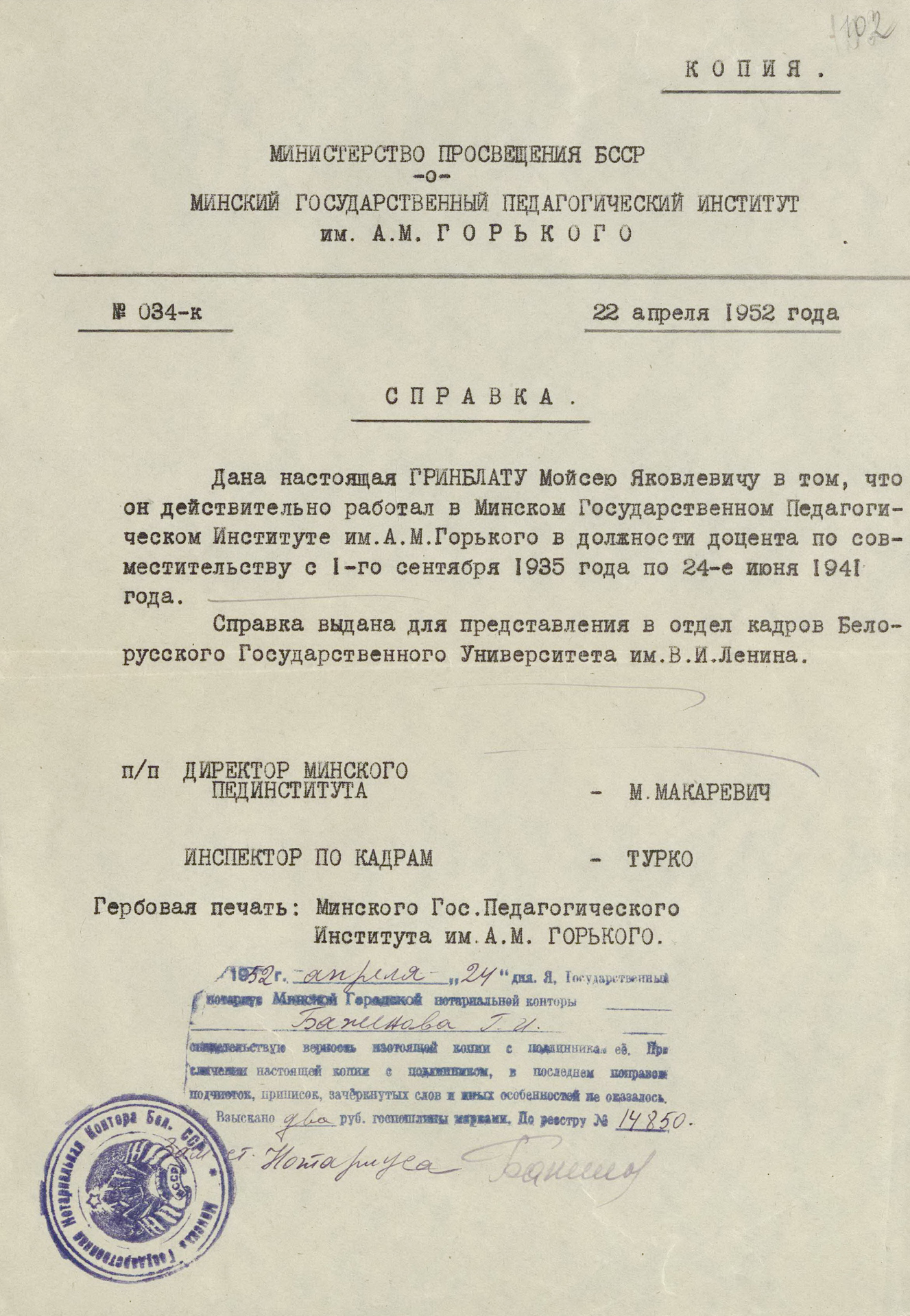 Отдельным комплексом выделены документы, касающиеся преподавательской деятельности М. Я. Гринблата в Минском государственном педагогическом институте и в БГУ (учебные программы, конспекты лекций, рефераты и семинарские работы студентов и др.). В этот же раздел включены материалы об участии фондообразователя в работе сессий, пленумов, конференций и др.