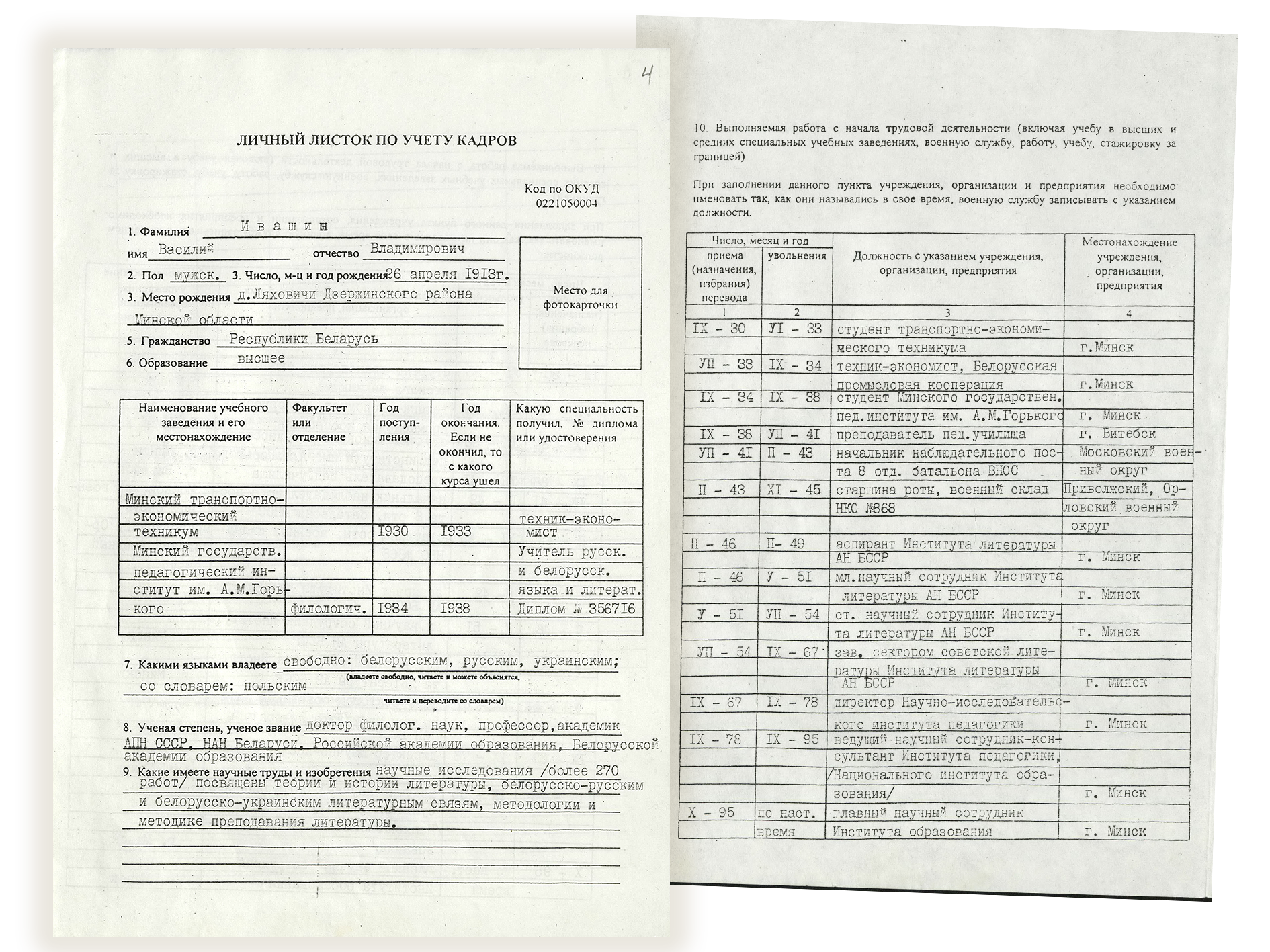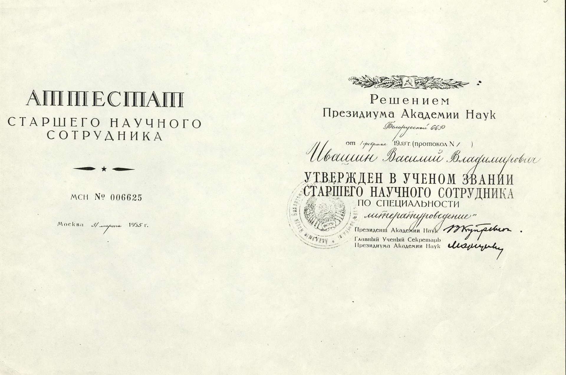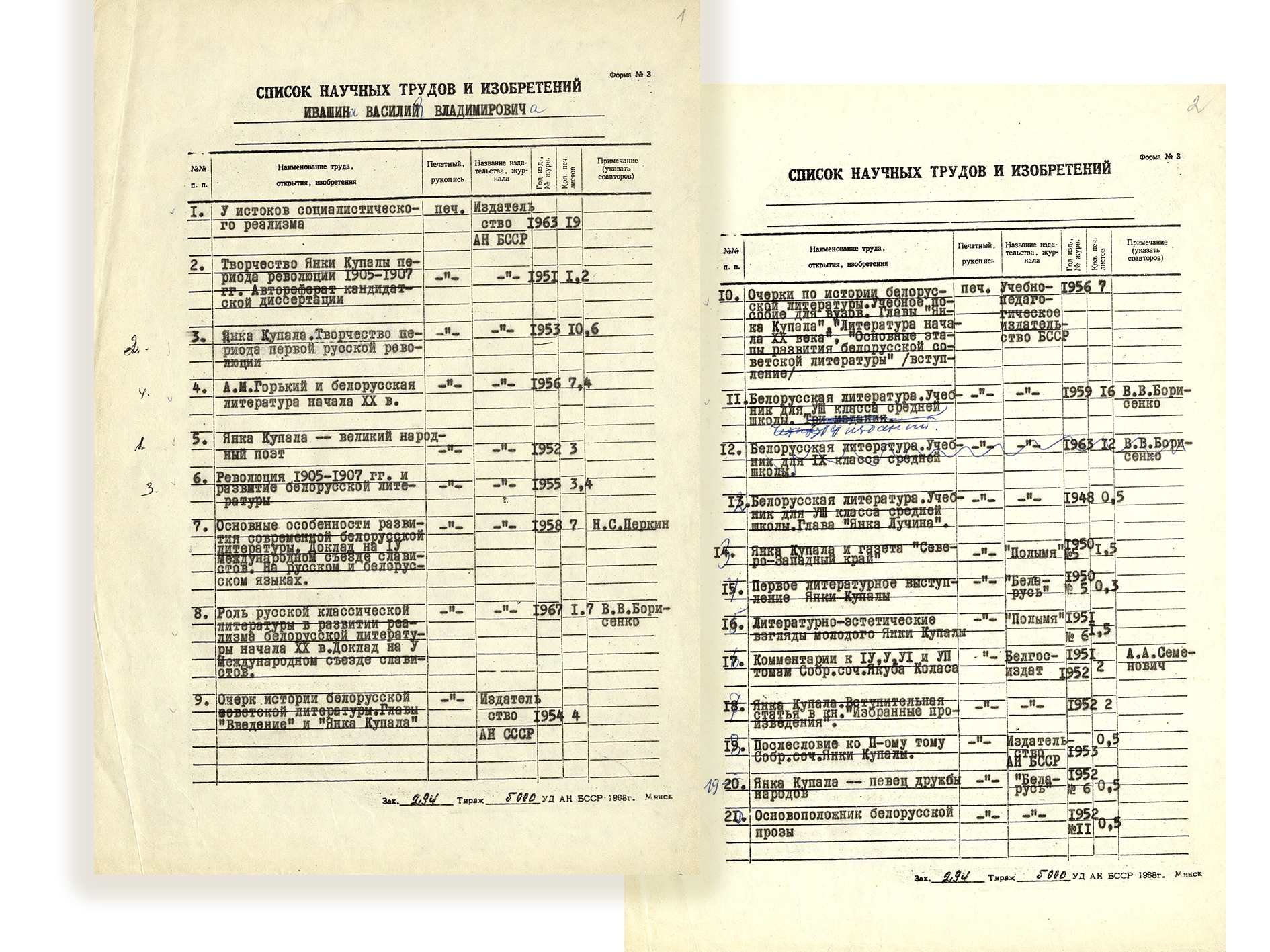 Документы научно-педагогической и служебной деятельности представлены протоколами заседаний Ученого совета Института литературы имени Я. Купалы АН БССР, отчетами В.В. Ивашина о научно-исследовательской работе за разные годы, материалами об участии ученого в работе специализированных советов по защите кандидитских диссертаций, программами курса белорусской литературы для 8–11 классов общеобразовательной школы, другими документами.