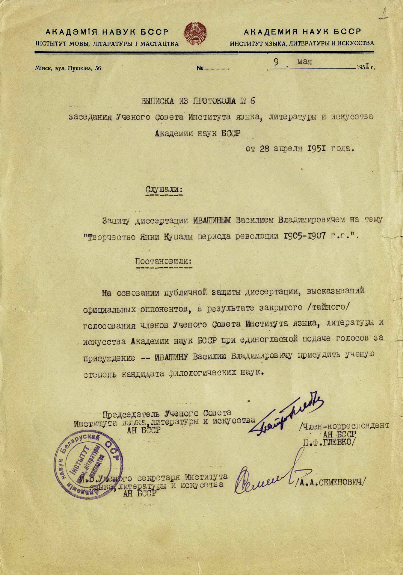 В 1946–1949 гг. учился в аспирантуре при Институте литературы Академии наук БССР, одновременно работал преподавателем белорусского языка и литературы в Республиканской партийной школе при ЦК КП(б)Б. После окончания аспирантуры в 1949 г. начал работать в Институте литературы АН БССР, в 1951 г. защитил кандидатскую диссертацию, в 1963 г. – докторскую.