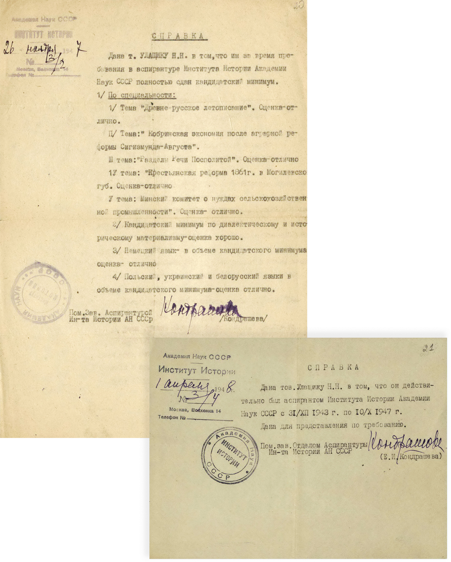 С 1939 г. жил и работал в Ленинграде. Одновременно с работой в школе занимался по программе аспирантского минимума при Ленинградском педагогическом институте им. А. Герцена, сдал несколько экзаменов. В 1943–1947 гг. Н.Н. Улащик учился в аспирантуре Института истории Академии наук СССР, в 1947 г. защитил кандидатскую диссертацию.