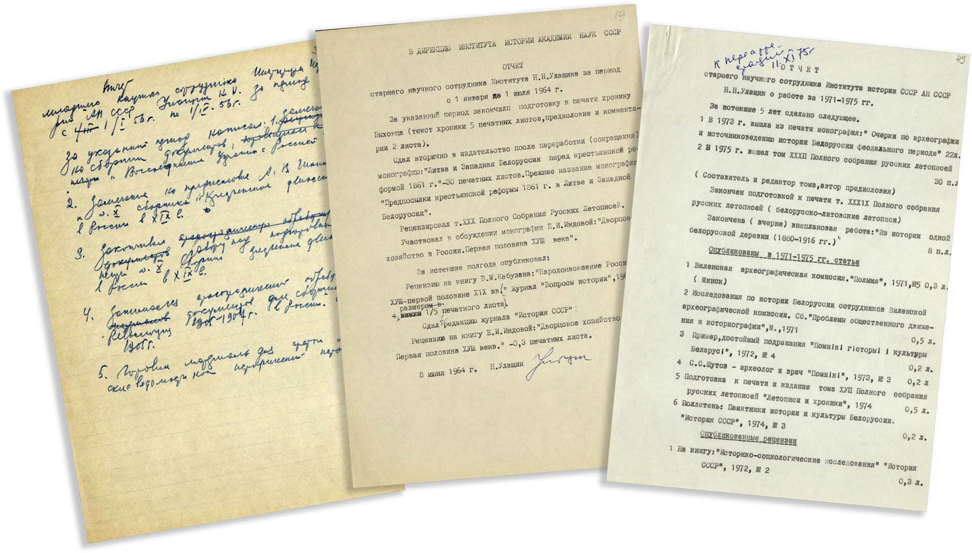 Раздел материалов служебного и общественного характера объединяет документы о работе Н.Н. Улащика в Институте истории Академии наук СССР (постановления, распоряжения, отчетная документация, материалы об участии в работе съездов, симпозиумов, сессий, конференций и др.); о работе с аспирантами, о преподавательской деятельности.