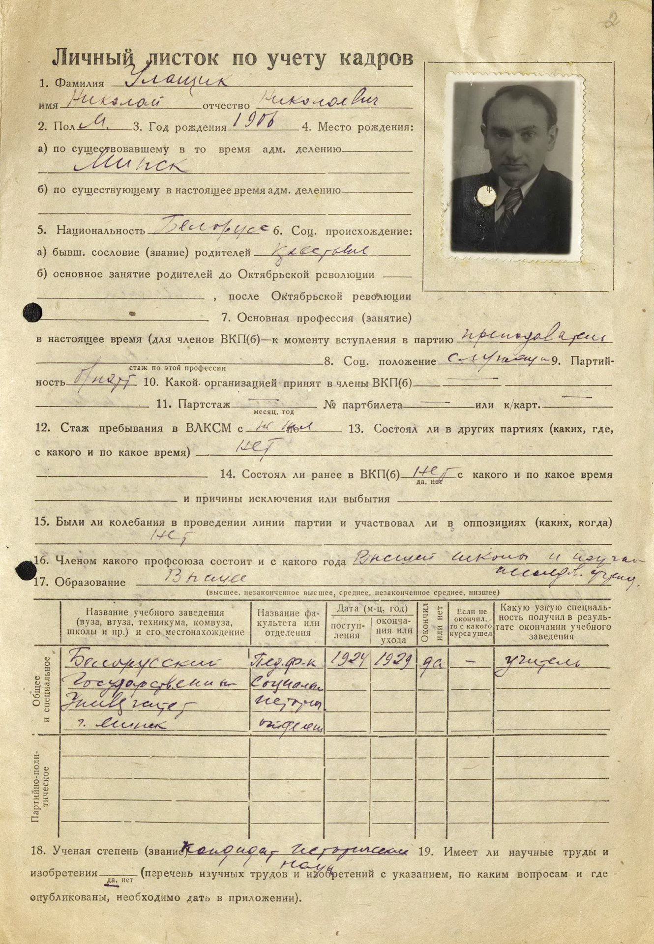 В 1913–1917 гг. учился в Самохваловичской школе, в 1917 – 1920 гг. – в высшем начальном училище в Минске. В 1924 г. Н.Н. Улащик окончил 2‑ю минскую вечернюю школу и поступил на социально-историческое отделение педагогического факультета Белорусского государственного университета, которое окончил в 1929 г.