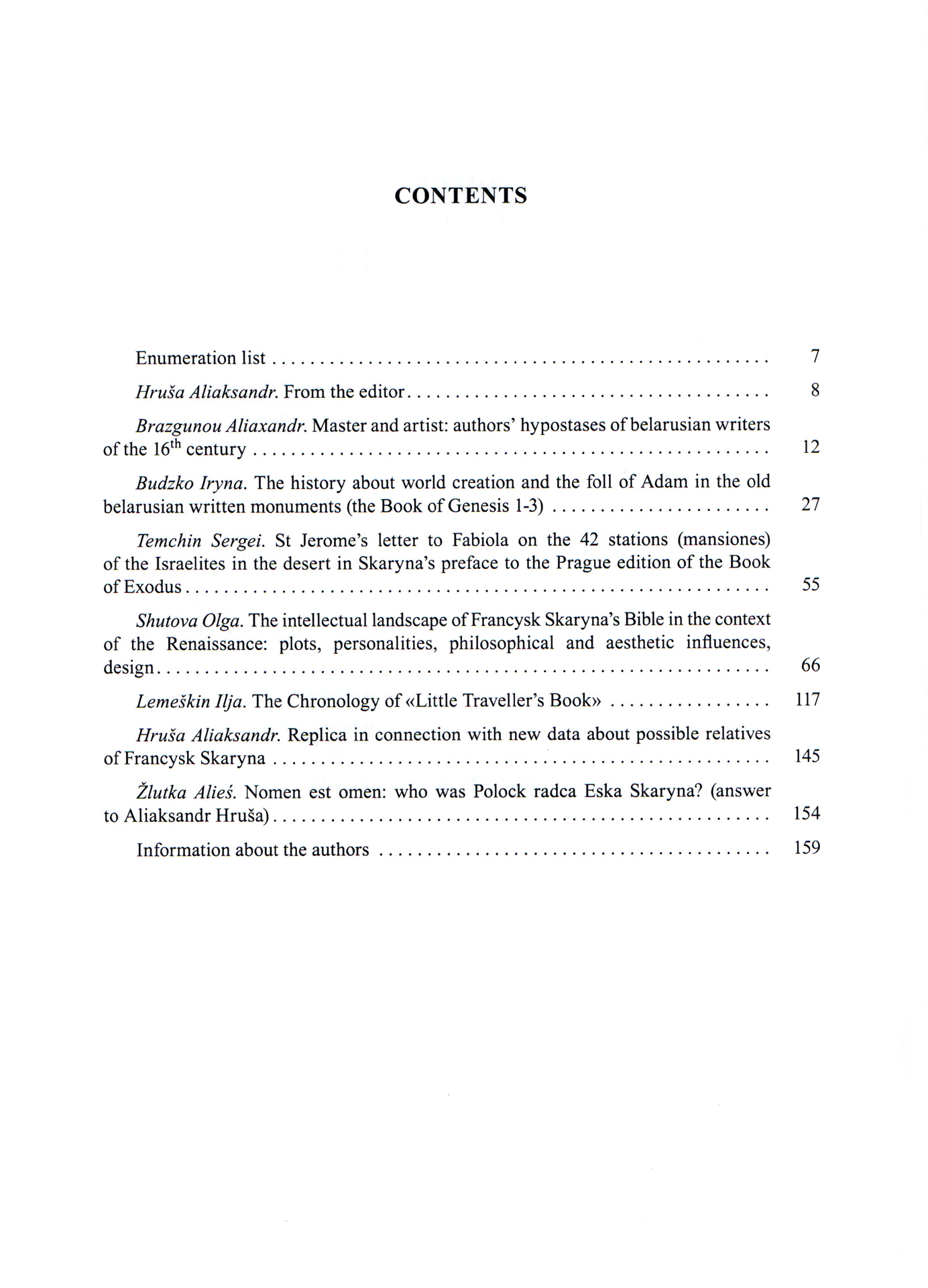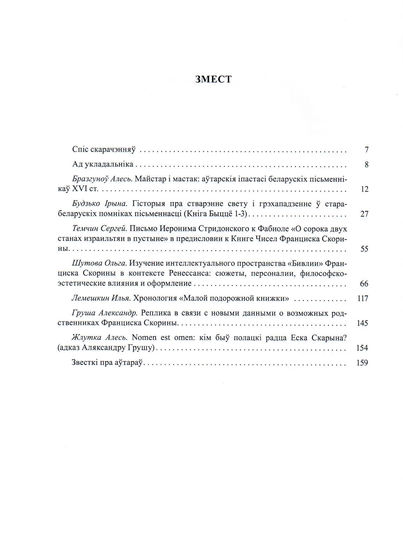 В очередном международном сборнике научных трудов, подготовленном Центральной научной библиотекой имени Якуба Коласа Национальной академии наук Беларуси, его авторы, профессиональные историки, литературоведы и лингвисты из Беларуси, Литвы, Чехии и Франции, освещают вопросы о разных ипостасях Скорины как литераторе (Алесь Бразгуноў), о его переводах (Ірына Будзько), хронологии «Малой подорожной книжки» (Илья Лемешкин), принципах работы просветителя с источниками (Сергей Темчин), об интеллектуальном пространство его «Бивлии» (Ольга Шутова) и круге родственников Скорины (Александр Груша, Алесь Жлутка).