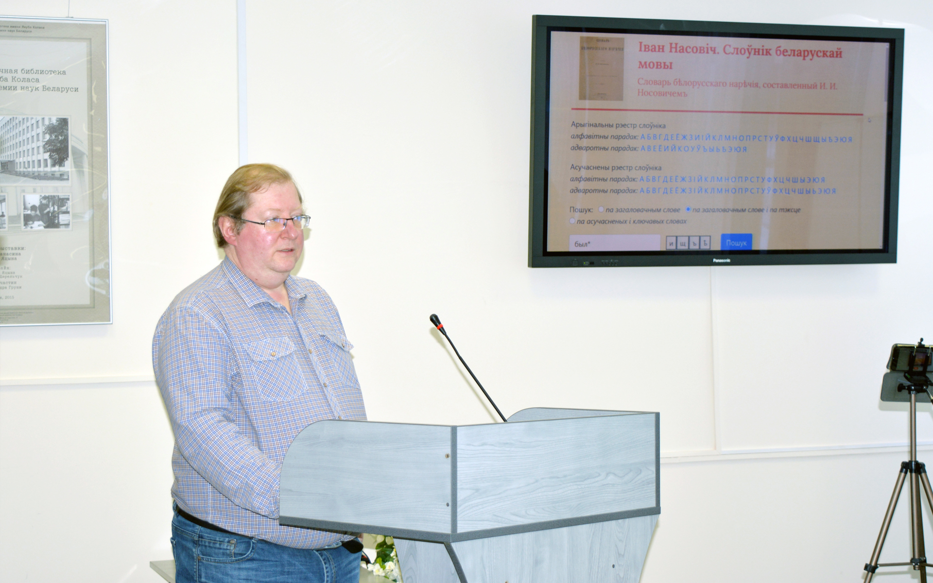 Прэзентацыю электроннага рэсурса прадэманстравалі кіраўнік праекта Алесь Булойчык і мовазнаўца Уладзімір Кошчанка, загадчык сектара камп’ютарнай лінгвістыкі Інстытута мовазнаўства імя Якуба Коласа.