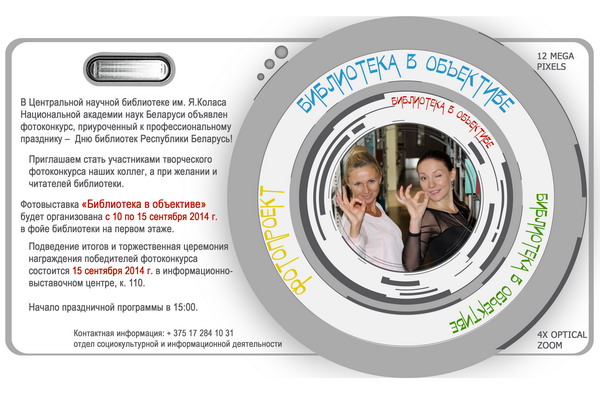 С целью популяризации деятельности и услуг библиотеки, а также выявления талантов в области фотографии, предоставления возможности продемонстрировать свои лучшие творческие работы, в Центральной научной библиотеке имени Я.Коласа НАН Беларуси (далее – ЦНБ НАН Беларуси) объявлен фотоконкурс, приуроченный к профессиональному празднику – Дню библиотек Республики Беларусь!