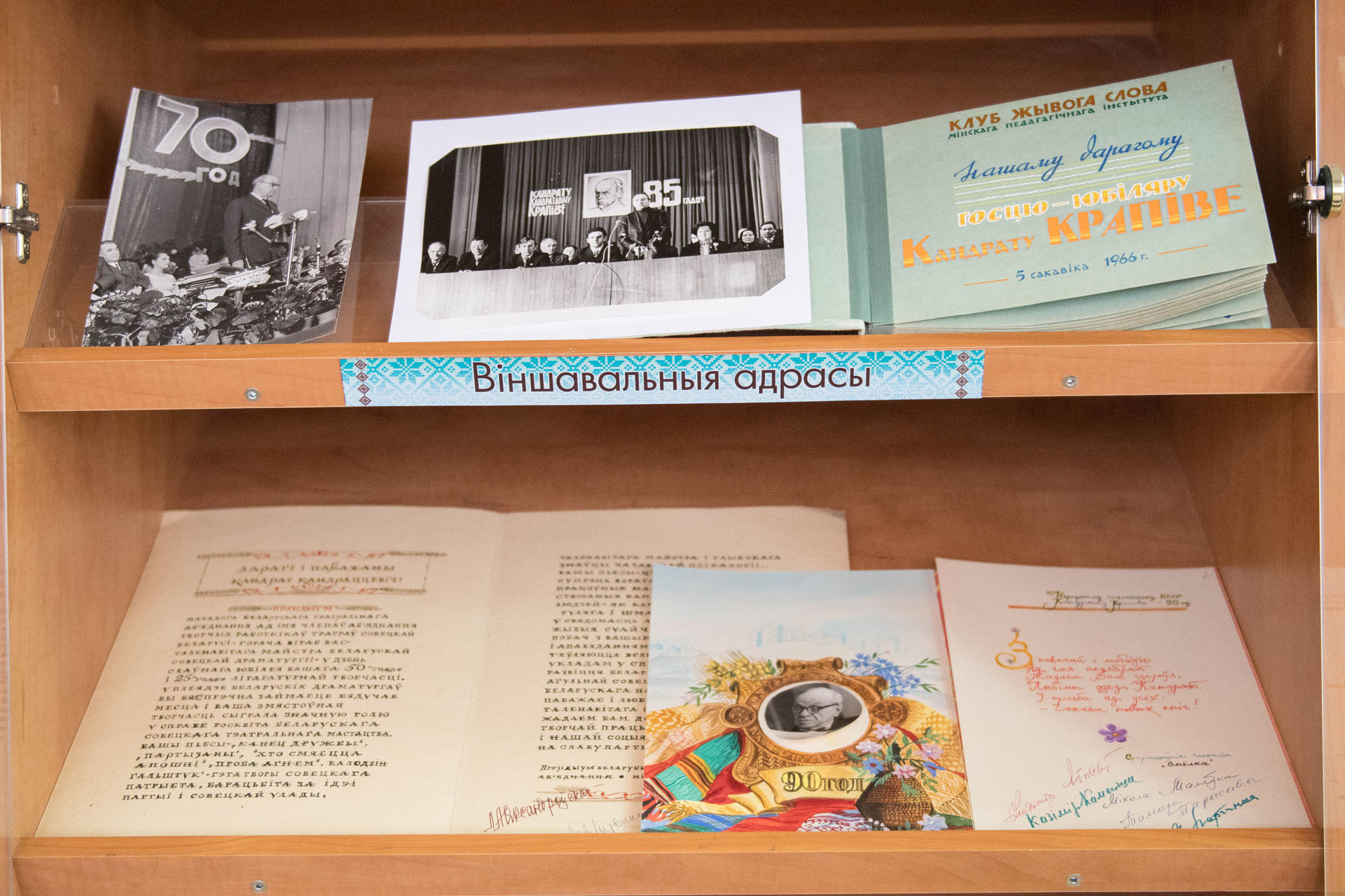 Адкрываюць выставу матэрыялы, што датычацца біяграфіі Кандрата Крапівы, сярод іх дакументы біяграфічнага характару, фотаздымкі сям’і, франтавыя лісты ад сына Барыса, які загінуў у час Вялікай Айчыннай вайны і інш.