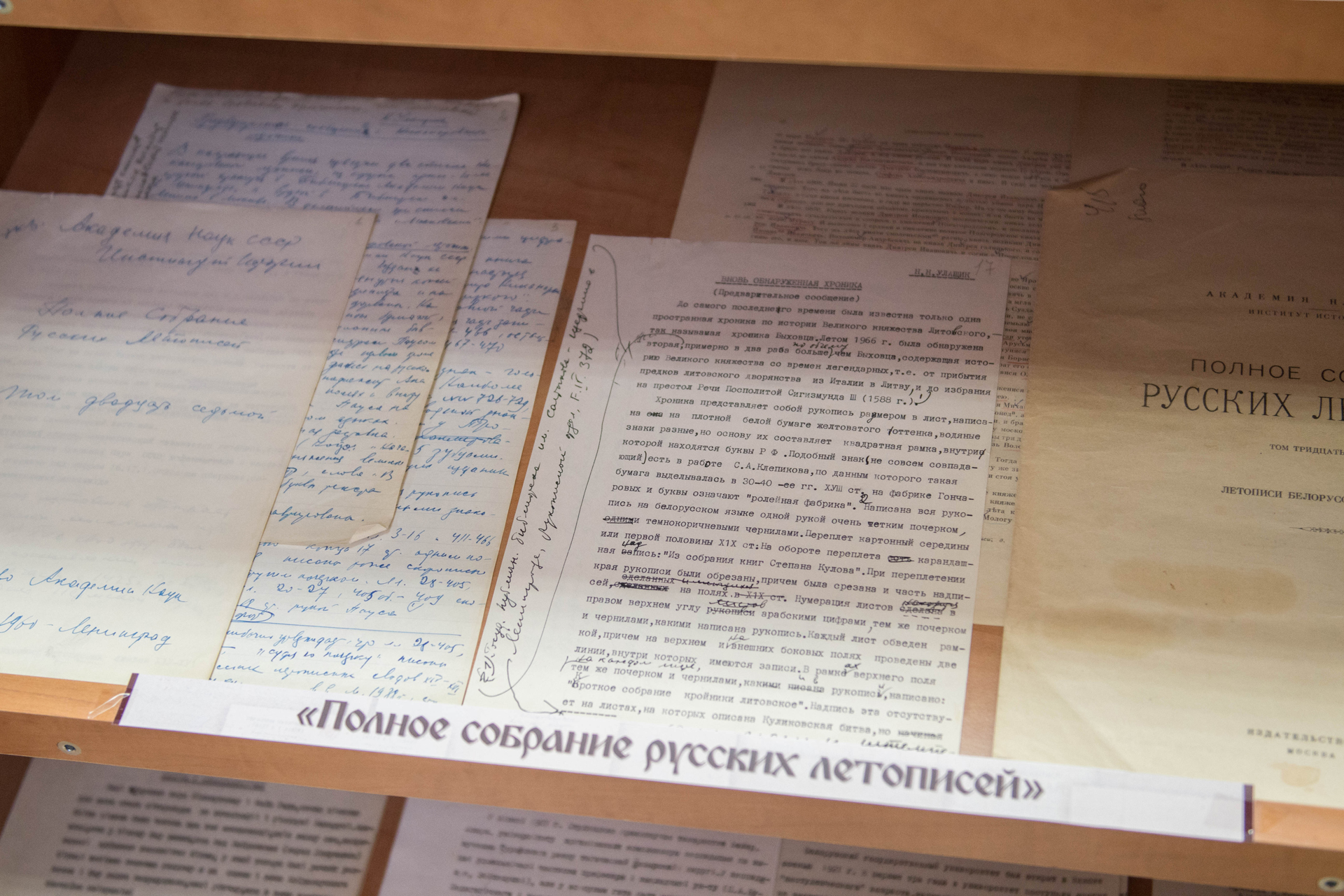 Отдельный раздел экспозиции отражает работу ученого по составлению и редактированию 32 и 35 томов «Полного собрания русских летописей», куда вошли все известные белорусско-литовские хроники.