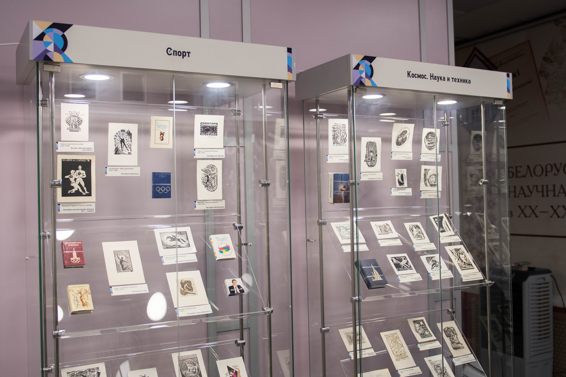 На стеллажах выставки представлены экслибрисы из коллекций белорусских собирателей – Николая Яковлевича Великанова (г. Могилев) и бывшего сотрудника Национальной академии наук Беларуси Михаила Ивановича Минкевича.